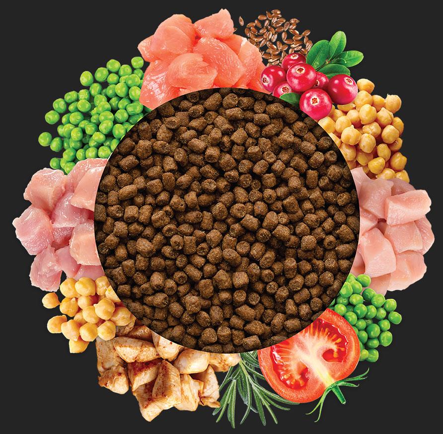Chicken, Chicken Meal, Turkey Meal, Dried Peas, Dried Chickpeas, Tapioca Starch, Chicken Fat (Preserved With Mixed Tocopherols), Natural Flavor, Tomato Pomace,